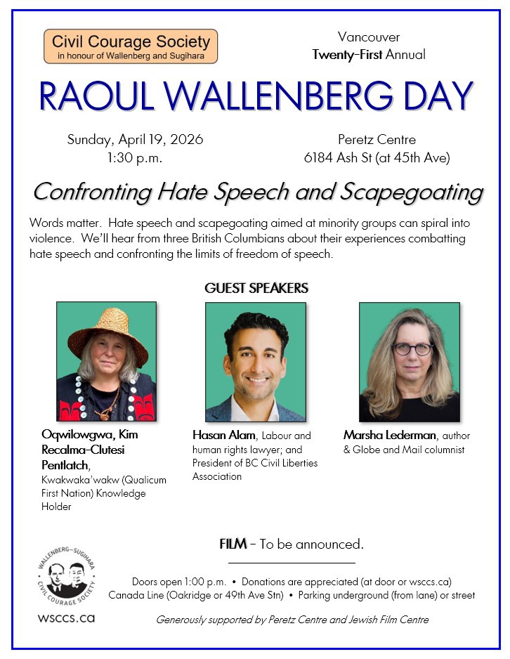 Please, by donating, help us to create Civil Courage events now and in future years. We are a registered charity – donations of $36 (+) will receive a tax receipt. You can use PayPal or credit/debit card to donate from a desktop or laptop computer (sorry, not from mobile phones).
